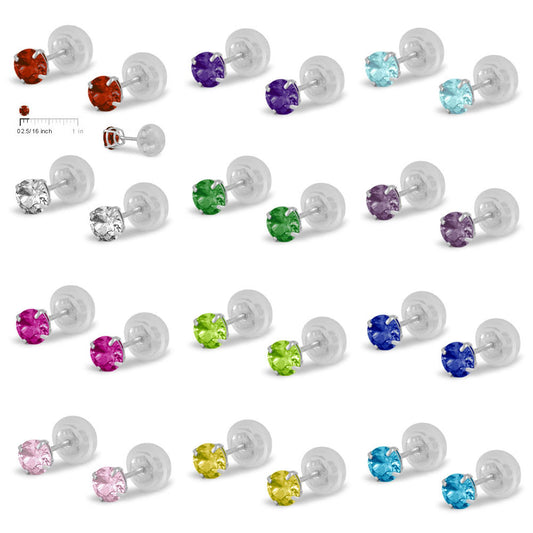 14K White Gold 4mm Birthstone Silicone Back Girl Stud Earrings