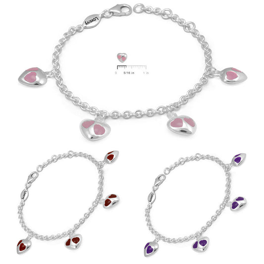 Girl's Sterling Silver Purple/Red/Pink Enamel Heart Charms Adjustable Bracelet