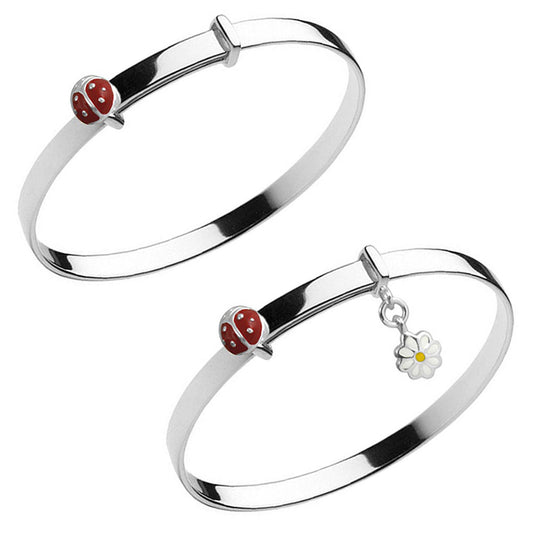 Girl's Silver Ladybug Bangle With or Without Daisy Charm (Up To 5 1/4 inches)