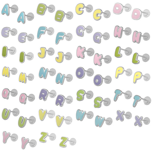 Kids Jewelry - Sterling Silver Color Enameled Initial Silicone Back Earrings