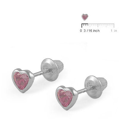 Kids 14K White Gold Pink C.Z. Heart Screw Back Earrings For Girls