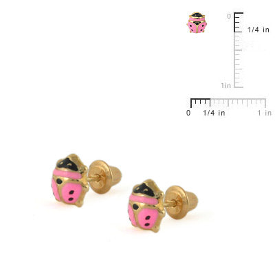 14K Yellow Gold Pink Enamel Ladybug Screw Back Stud Earrings For Girls