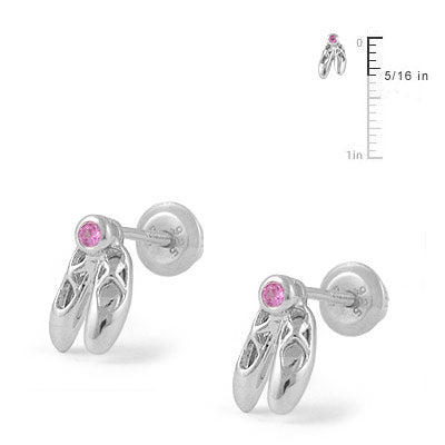 Girl's Sterling Silver Pink CZ Ballet Shoe Screw Back Stud Earrings