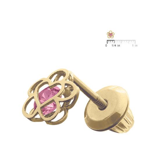 14K Yellow Gold Pink CZ Open Flower Screw Back Earrings For Girls