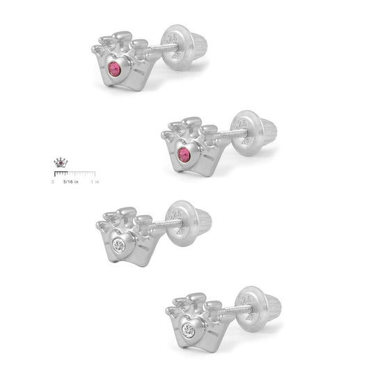 Girl's Jewelry - Silver Diamond Or Pink CZ Princess Crown Screw Back Earrings