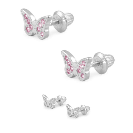 Sterling Silver White Or Pink Cubic Zirconia Butterfly Girls Screw Back Stud Earrings