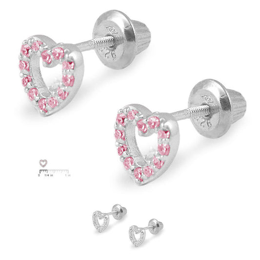 Girl's Sterling Silver White Or Pink C.Z. Open Heart Screw Back Stud Earrings