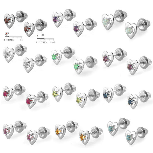 14K White Gold Heart Birthstone Screw Back Stud Earrings For Girls