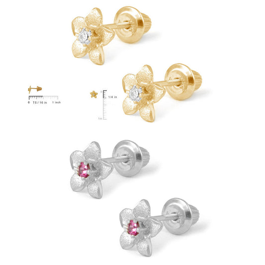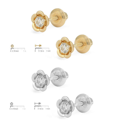 Little Girl 14K Yellow Gold Or Silver CZ Flower Shaped Screw Back Stud Earrings