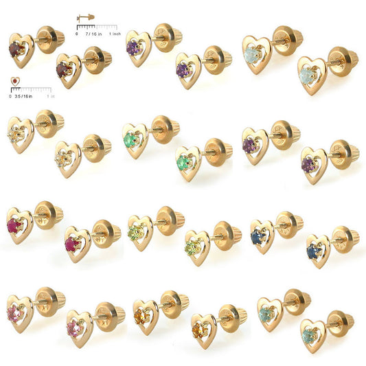 14K Yellow Gold Heart Birthstone Screw Back Stud Earrings For Girls