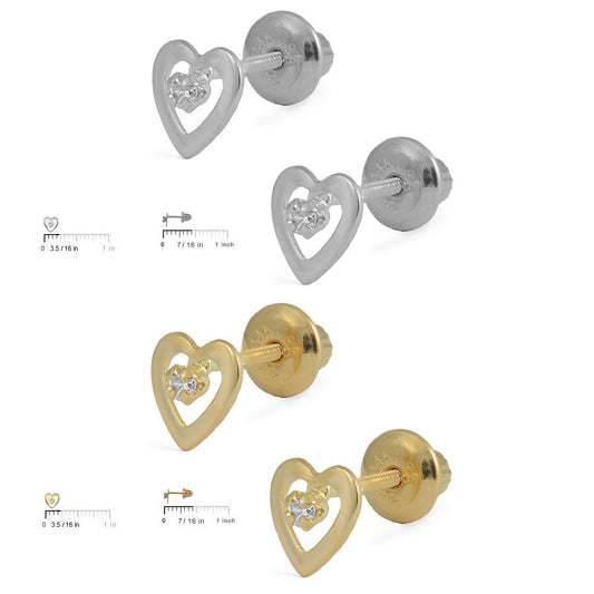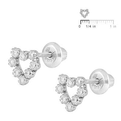 14K White Gold C.Z. Open Heart Screw Back Earrings For Children & Teenagers