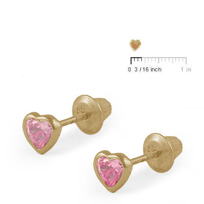 Kids 14K Yellow Gold Pink C.Z. Heart Screw Back Earrings For Girls