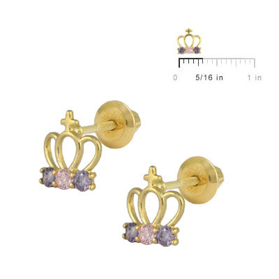 14K Yellow Gold Pink/Purple CZ Crown Screw Back Earrings For Girls