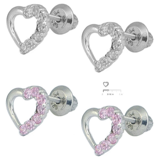Girl's Sterling Silver Pink/White Cubic Zirconia Open Heart Screw Back Stud Earrings