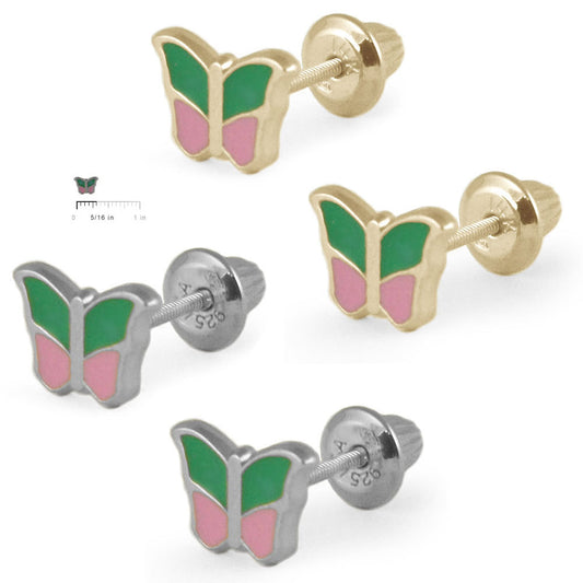 Girls Silver Or 14K Yellow Gold Pink/Green Enamel Butterfly Screw Back Earrings