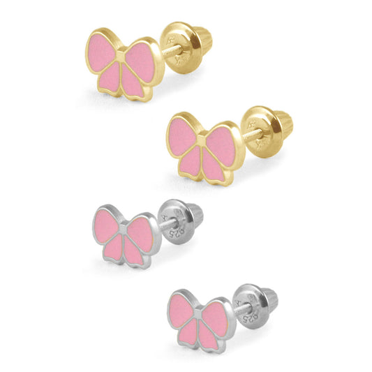Yellow Gold Or Silver Pink Enamel Bow Screw Back Stud Earrings For Girls