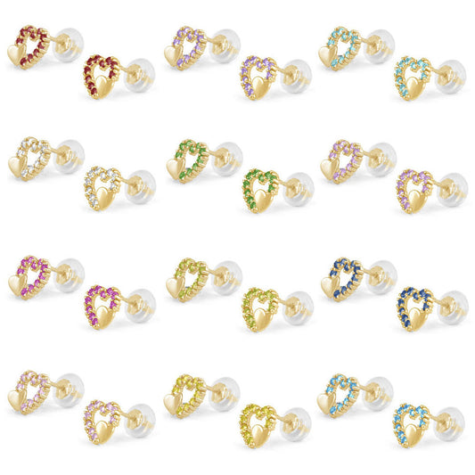 14K Yellow Gold Birthstone Double Hearts Girls Stud Earrings