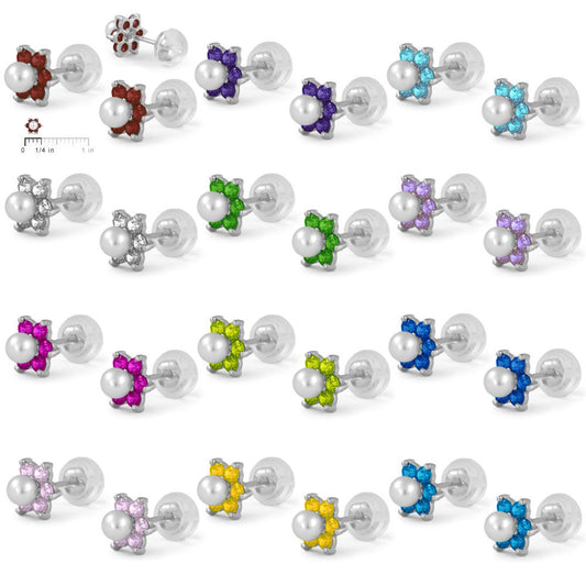 14K White Gold Simulated Birthstone And Pearl Flower Stud Earrings For Girls