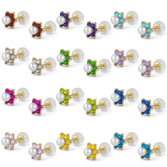 14K Yellow Gold Simulated Birthstone And Pearl Flower Stud Earrings For Girls