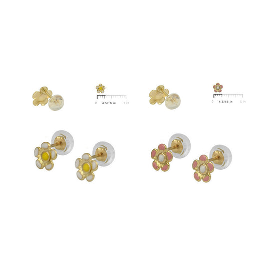 Little Girl 14K Yellow Gold Pink/White Flower Silicone Back Stud Earrings