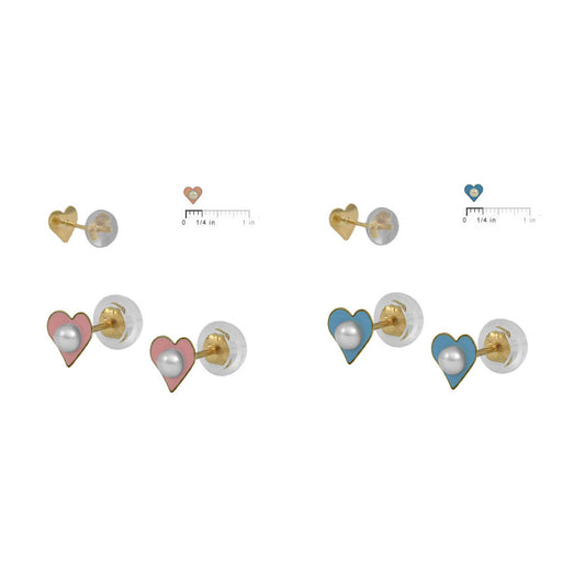 Girl 14K Yellow Gold Blue/Pink Heart Pearl Silicone Back Earrings