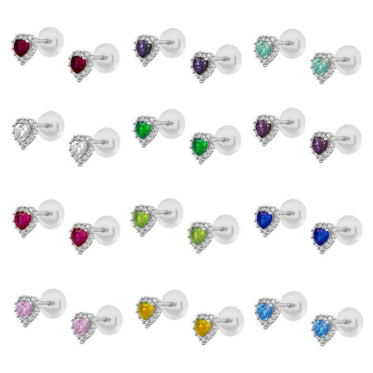 Little Girls Silver Birthstone Silicone Back Heart Shaped Earrings