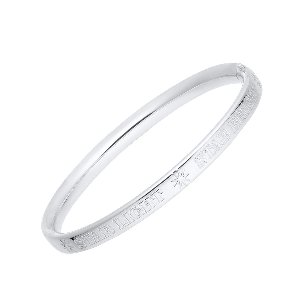 This highly polished sterling silver bangle bracelet comes in 2 styles, one is etched with words "Live", "Love" and "Sparkle", also with heart and star symbols in between; another one is etched all around with words "Star Light" and "Star Bright", also with star symbols among them. The bangle is specially designed for children at 6 1/4 inches around, the hinged opens another 1 1/4 inch for it to slip easily on to a girl hands. A great jewelry gift for any occasion.- Age (Yrs): 2-10 (Age recommendation is approximate)