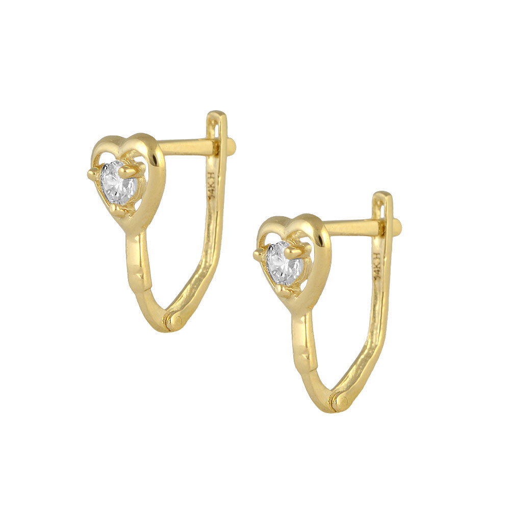 Girl's fine jewelry for children, preteens and teens. These earrings are crafted of highly polished 14k yellow or white gold, each earring is designed in open heart shape and inlaid with a sparkling white cubic zirconia in the center. The latch backs are comfortable and smooth to open and close. They simply shine!
