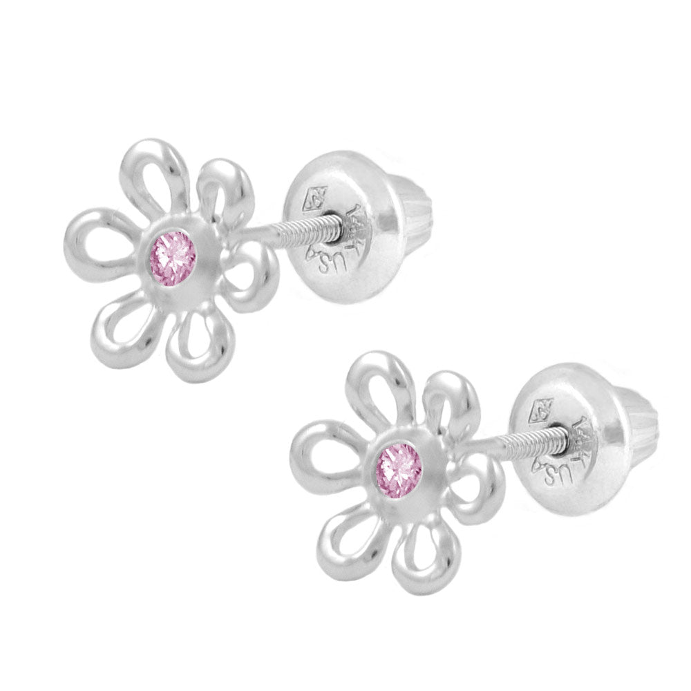 These sweet girl's stud earrings are made of highly polished sterling silver. Each earring features a daisy flower accented with sparkling diamonds or pink cubic zirconias at its center. They are designed for children and teens, the screw back is smooth on the bottom for comfort and safety. A perfect choice to wear every day.- Age (Yrs): 0-16 (Age recommendation is approximate)