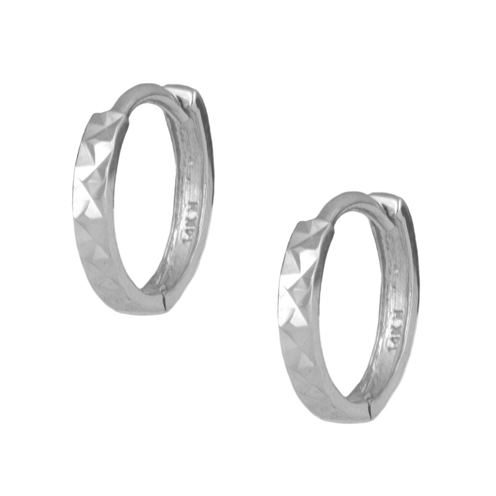 Fine jewelry for children. These diamond cut huggie hoop earrings are made of 14K yellow or white gold and absolutely sparkle! The hinged closure is comfortable and easy to open and close. A beautiful design, perfect to wear every day.