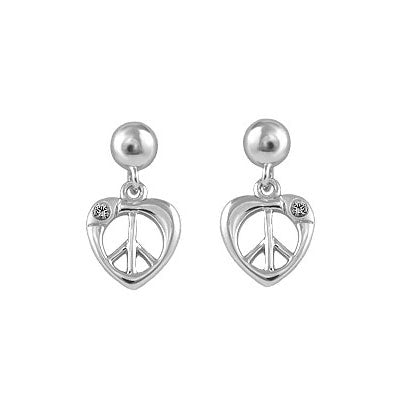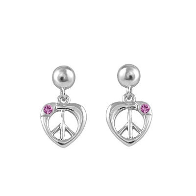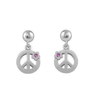 Beautiful children's jewelry - Dangling peace sign earrings are accented with two sparkling diamonds or pink sapphires, in either heart shape or round shape accented with a flower. They are made of sterling silver with both textured surface of satin and high polish finish. Regular push on backing. Great gift choice for child or teen girls.- Age (Yrs): 2-16 (Age recommendation is approximate)