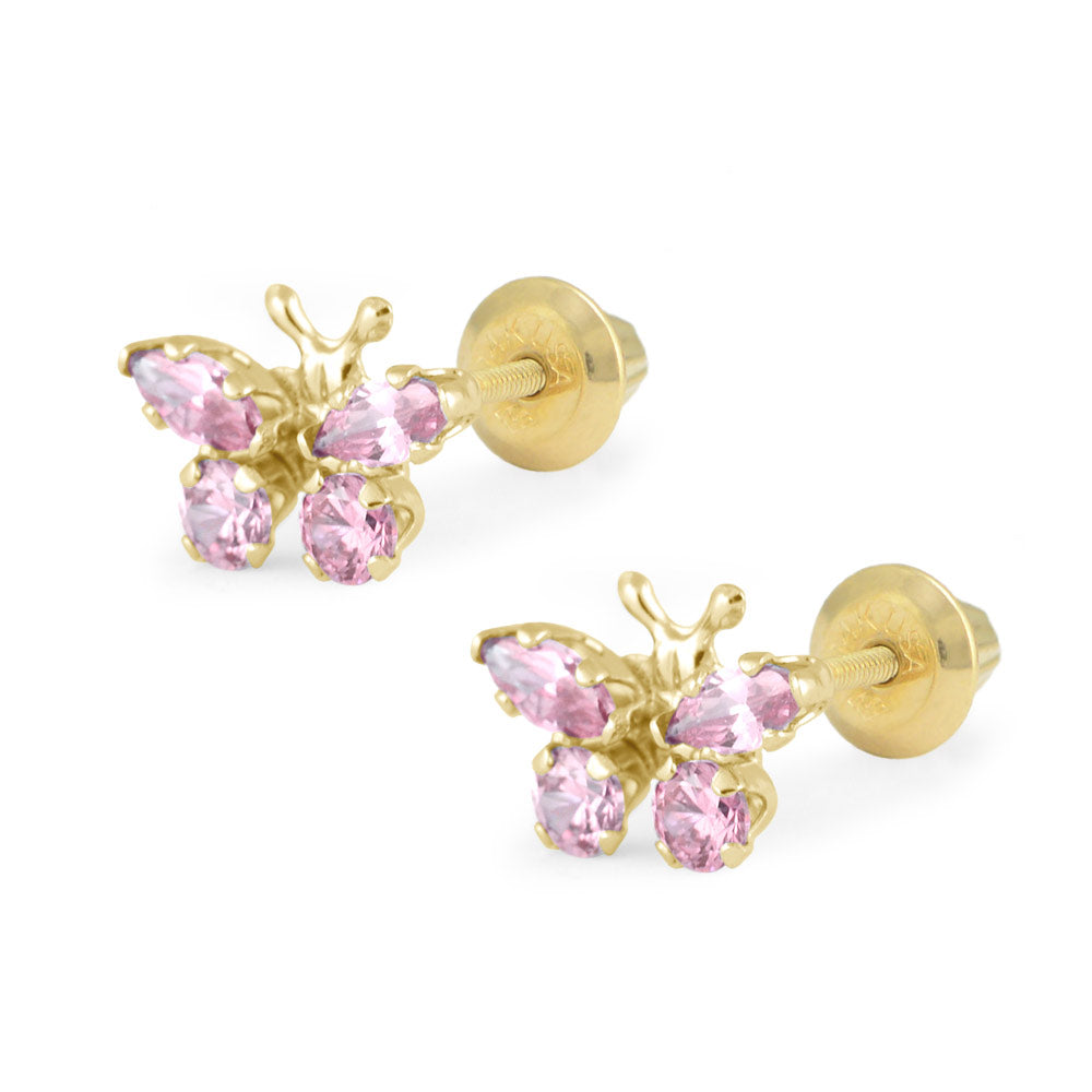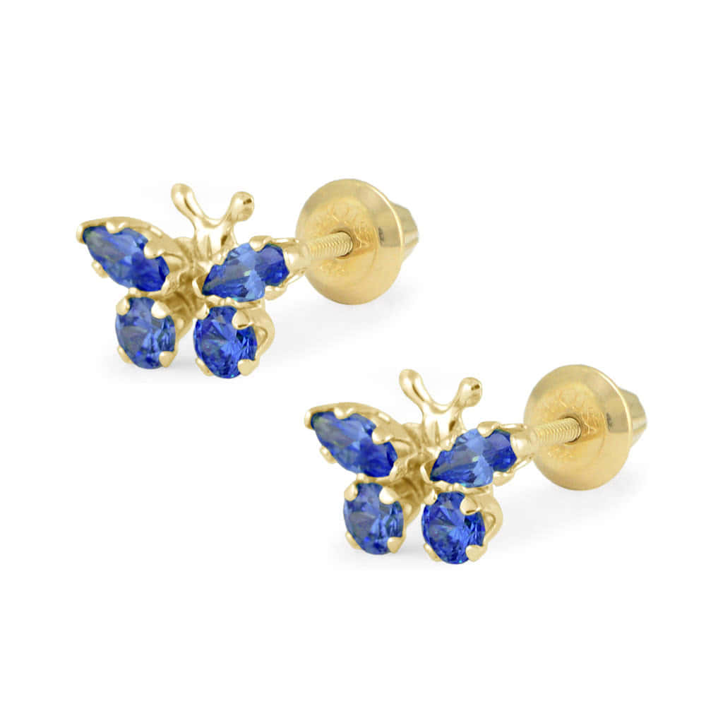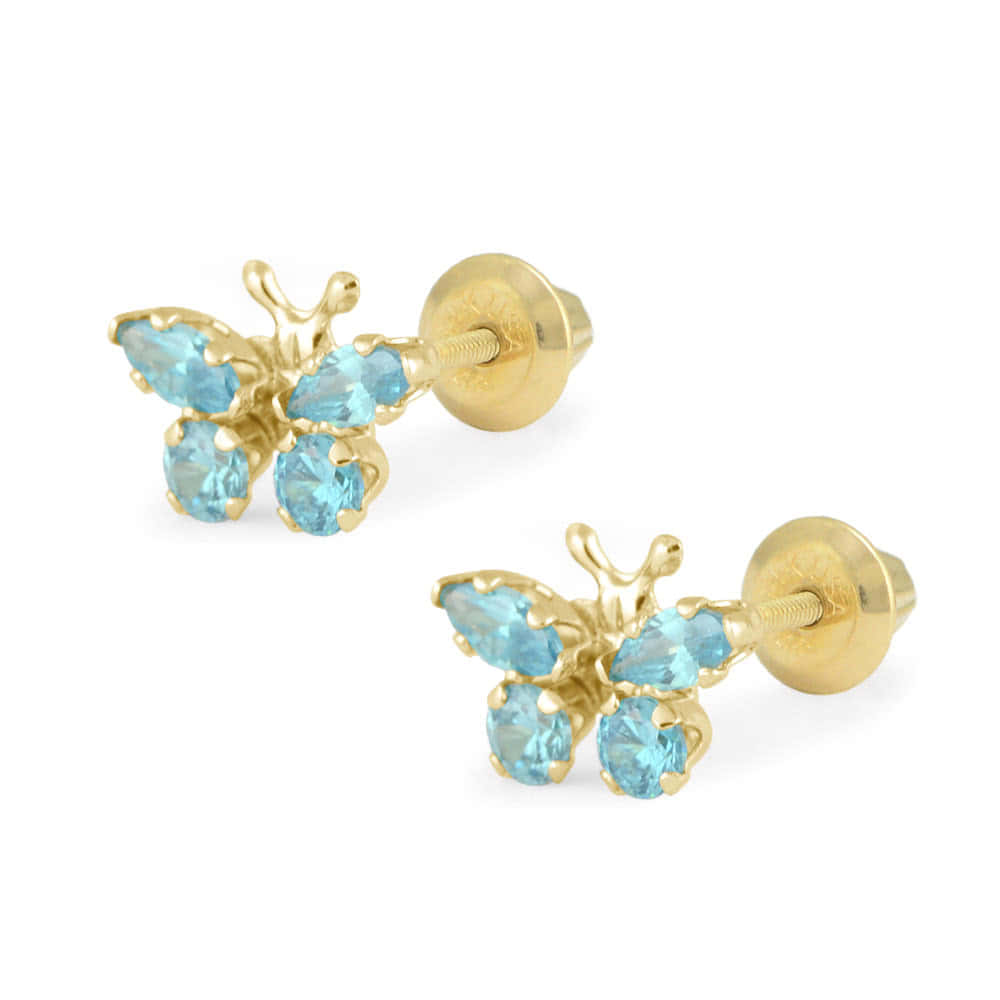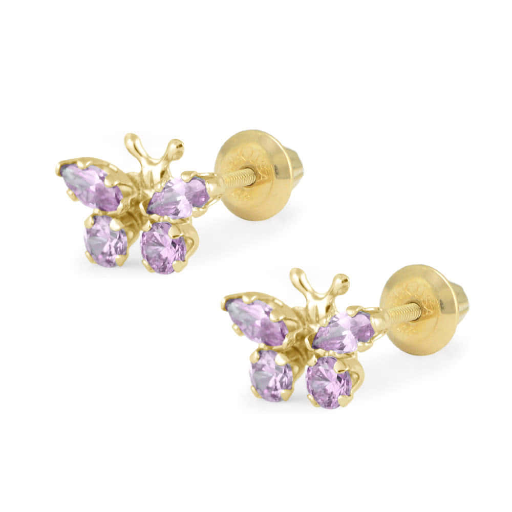 These earrings are crafted of 14k yellow gold, each stud features a beautiful butterfly which's wings are formed with four colorful cubic zirconias to simulate 12-month birthstone. Screw backs are safe, secure and comfortable for daily wearing. A delicate fine jewelry gift for girls from babies to teens.- Age (Yrs): 0-16 (Age recommendation is approximate)