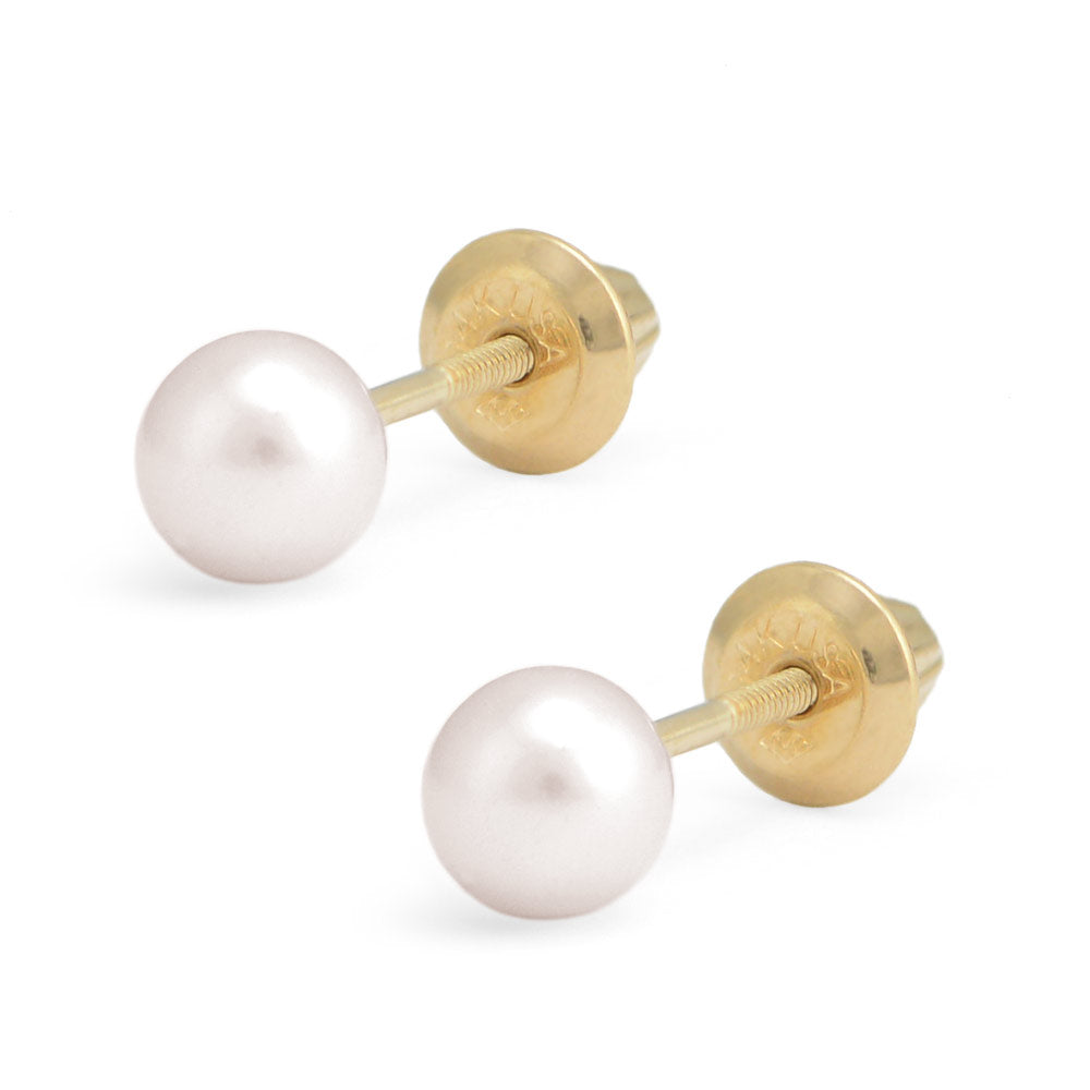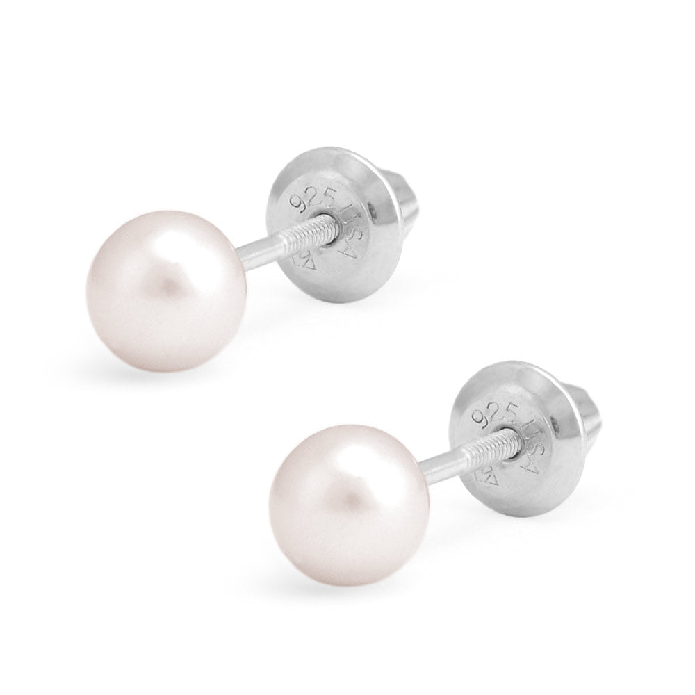These pretty earrings each features a 4mm freshwater cultured white or pinky pearl mounted on sterling silver, 14k yellow gold or 14k white gold setting. They are designed for girls of all ages with shorter post. Smooth safety screw backs make it a perfect fine jewelry gift for everyday wear.