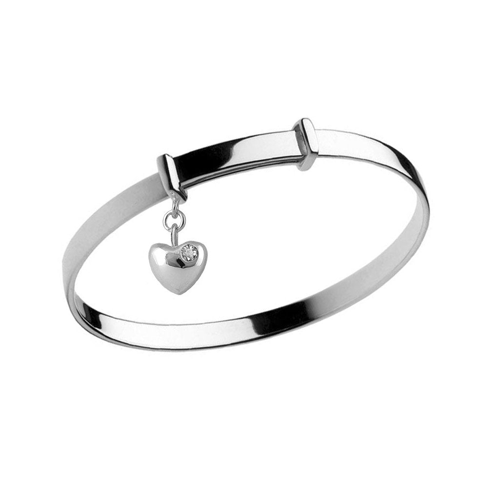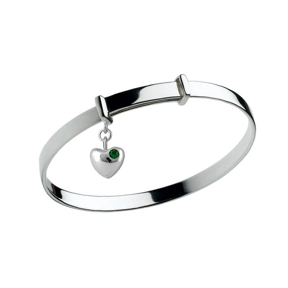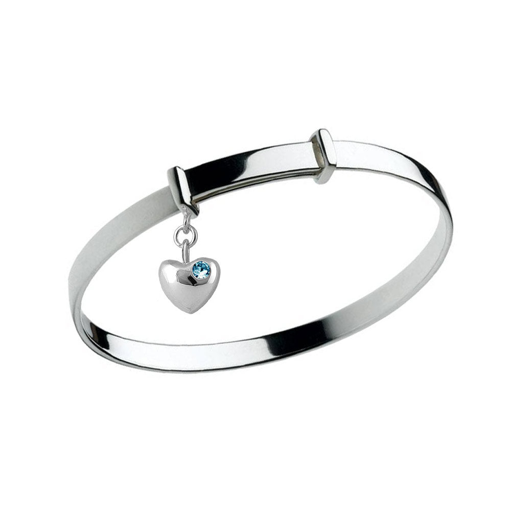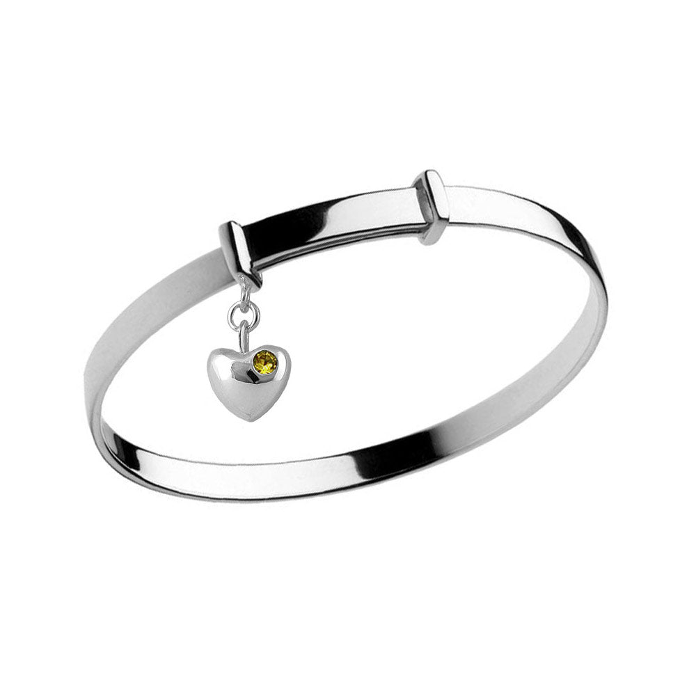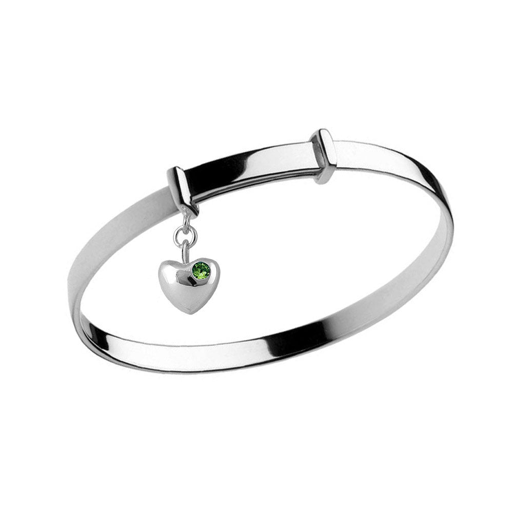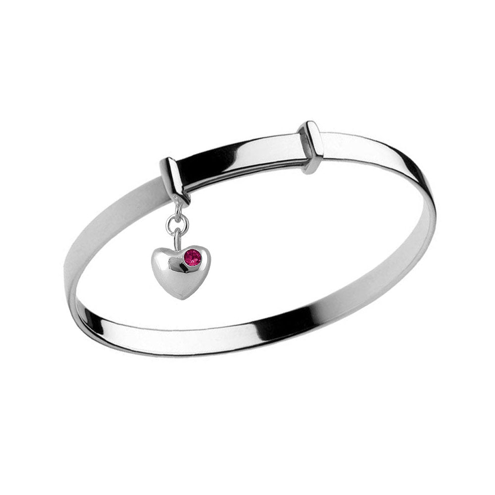 Little girls jewelry for babies and toddlers. This solid high polished sterling silver children bangle bracelet features a dangling heart charm set with a sparkling swarovski crystal to simulate 12-month birthstones, it's adjustable from 4 1/4 to 5 1/4 inches and can be personalized by our laser engraving service. Gift choice for many occasions like baptism, christening, birthday or holidays, etc.