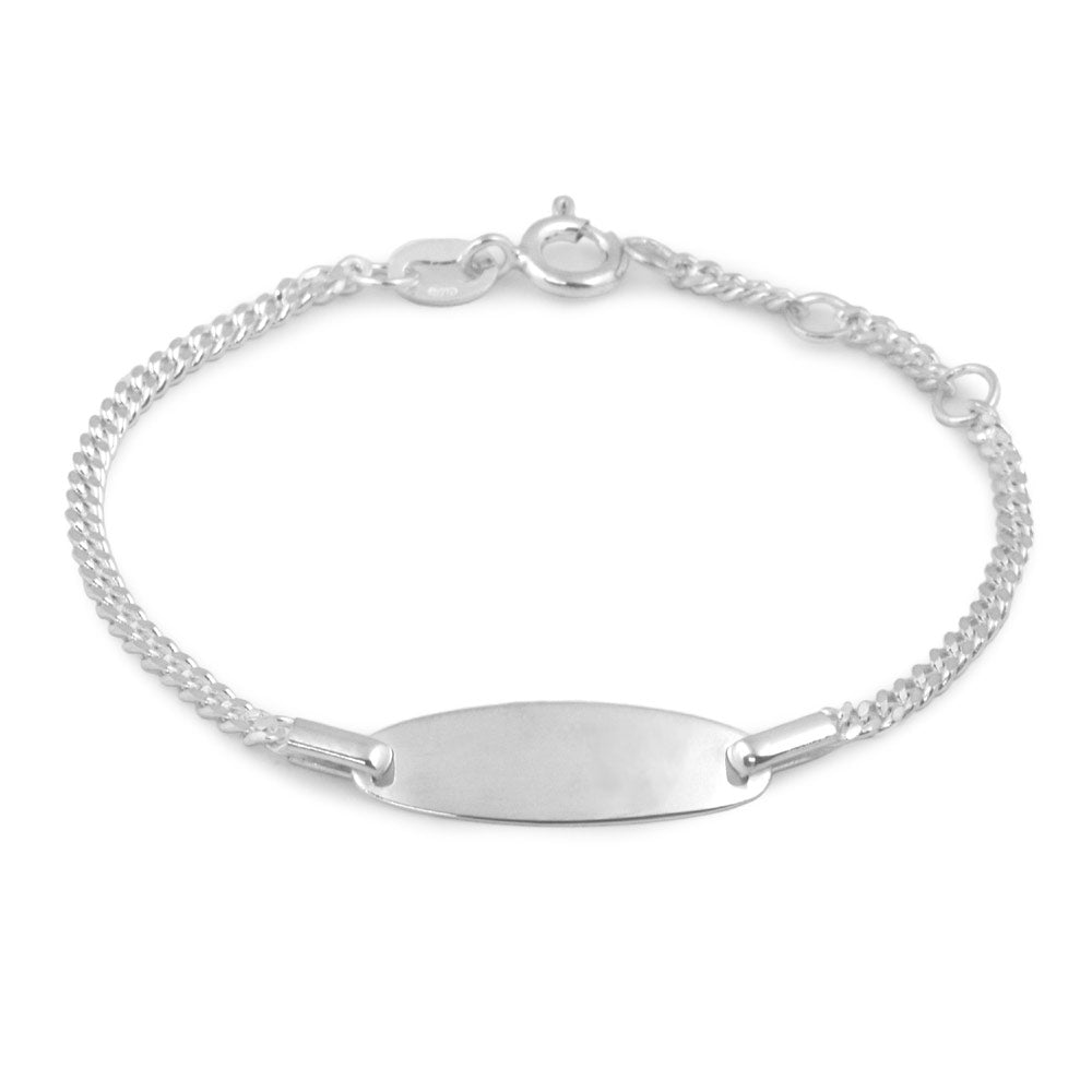 Girls jewelry for babies and toddlers. This 5 1/2 inches curb linked ID bracelet is crafted with sterling silver, that has two loops so it can be hooked up shorter to 5 1/8 and 4 3/4 inches. Cut out heart or plain name plate is 1/4 by 3/4 inches and can be personalized by our laser engraving service. Gift choice for any occasions such as baptism or christening, etc.